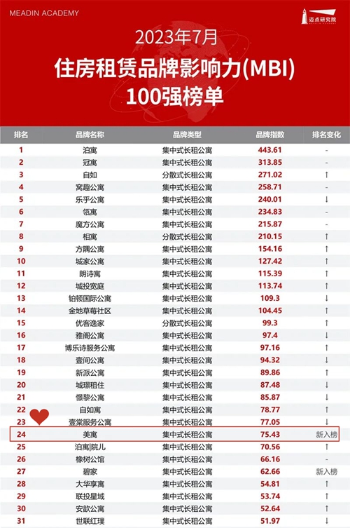 邁點(diǎn)研究院獨(dú)家發(fā)布的“2023年7月住房租賃品牌影響力(MBI)100強(qiáng)榜單”。鄭州城市發(fā)展集團(tuán)城發(fā)美寓進(jìn)入榜單前二十五。