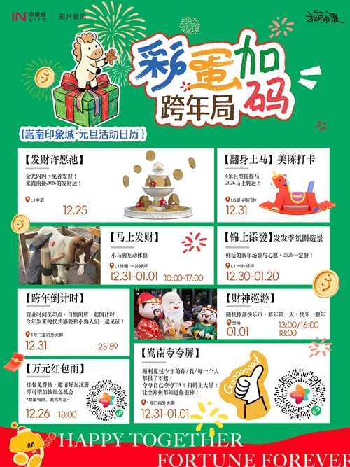 12月31日-1月3日,憑快樂幣可免費騎小馬、抽獎、兌換零食禮包,輕松實現(xiàn)童趣與味蕾雙重滿足??缒暌梗虉鰻I業(yè)時間延長至23:00后自然閉店,大屏同步跨年倒計時,和親友一起在歡呼聲中迎接2026,氛圍感直接拉滿!